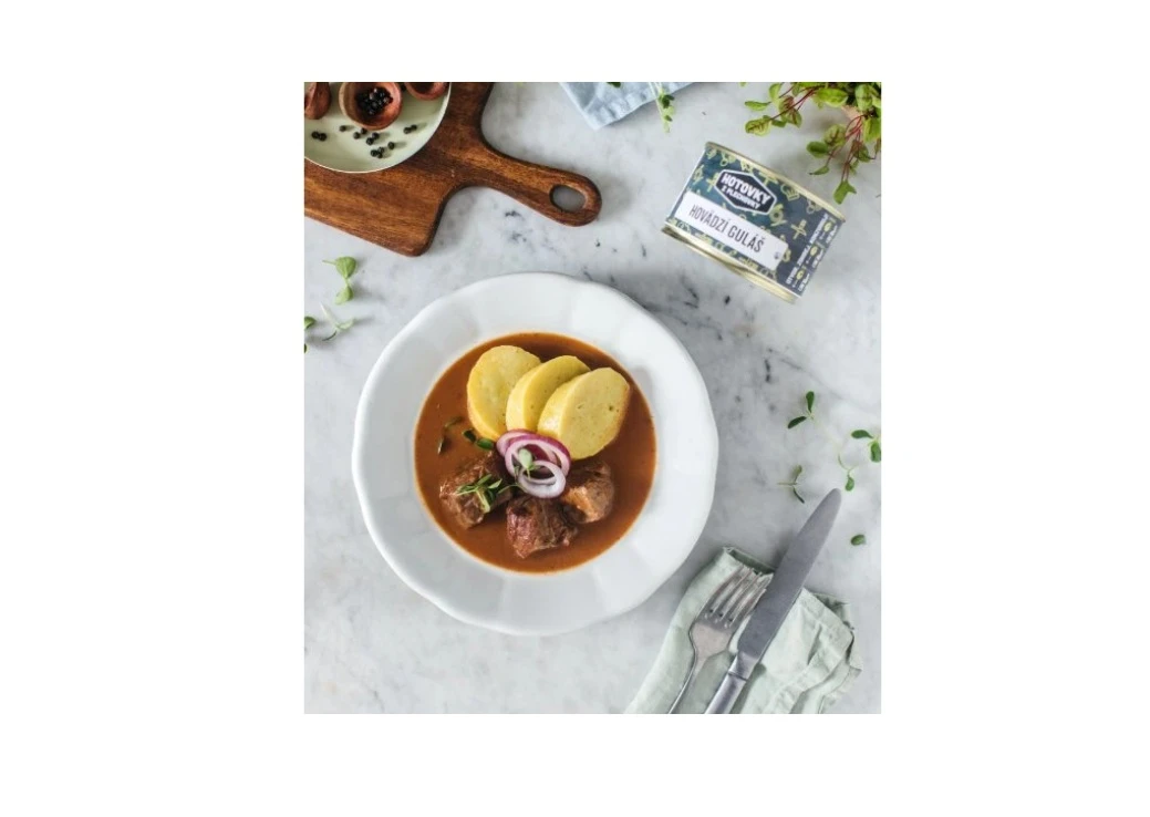 Vynikající hovězí guláš ze poctivého masa, na kterém si skutečně pochutnáte. Právě Hotovky z plechovky nabízejí sterilizované hotové jídlo v konzervách, které stačí jen zahřát a pochutnat si jako v restauraci. Ať už jste u vody a užíváte si rybaření nebo kempujete s rodinou a přáteli, tak stačí jen zahřát konzervu a dosyta se najíst. Balení 400ml je určeno pro bohatý oběd pro jednu osobu, 800ml postačuje pro dva lidi na plnohodnotné jídlo. Všechna jídla jsou slovenské výroby, přičemž splňují všechny potravinářské standardy a jsou zárukou vysoké kvality.