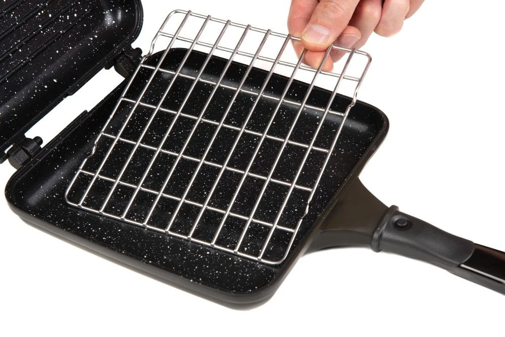 •Súčasťou je mriežka z nerezovej ocele obmedzujúca kontaktu pripravovaných sladkostí a pizze s povrchom panvice, omedzuje tak ich pripálenie.