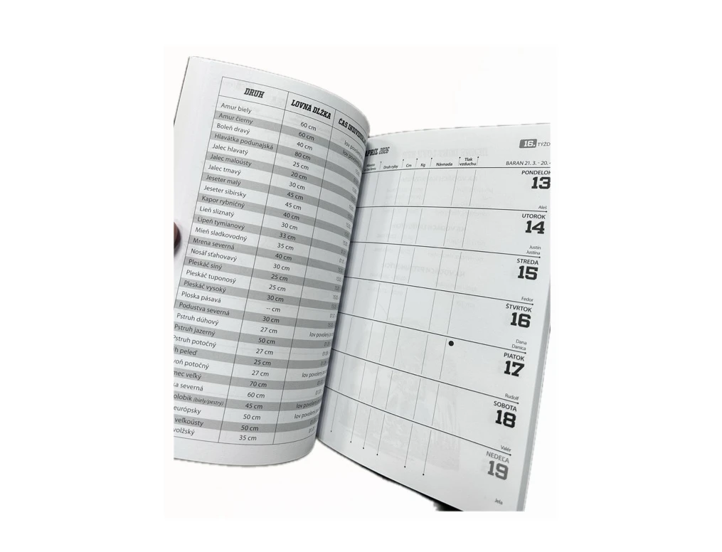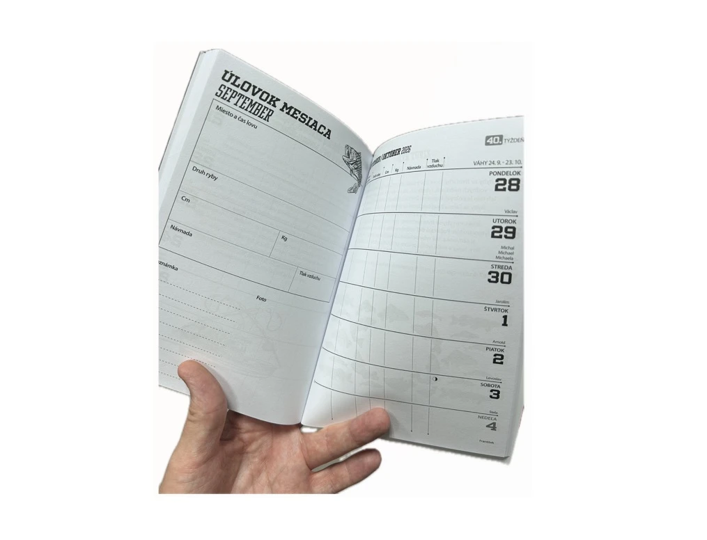 Tento diář je velmi přehledný a propracovaný, má sloupce, kde si umíte zaznačit druh ulovené ryby, její délku, váhu, návnadu na jakou jste rybu chytili, jaký byl tlak vzduchu, jaké bylo počasí a mnoho jiného. Samozřejmostí jsou také zobrazené fáze měsíce či jména v kalendáři.